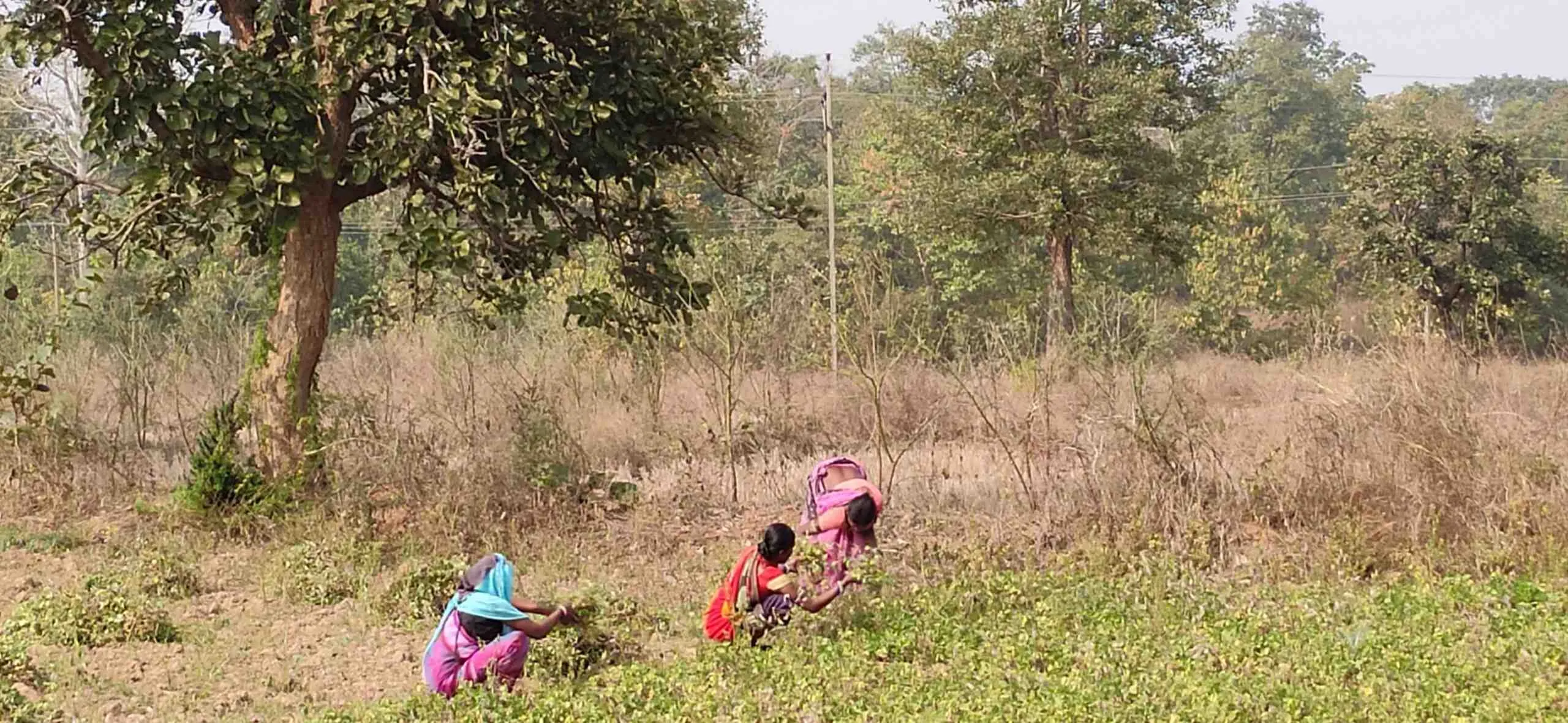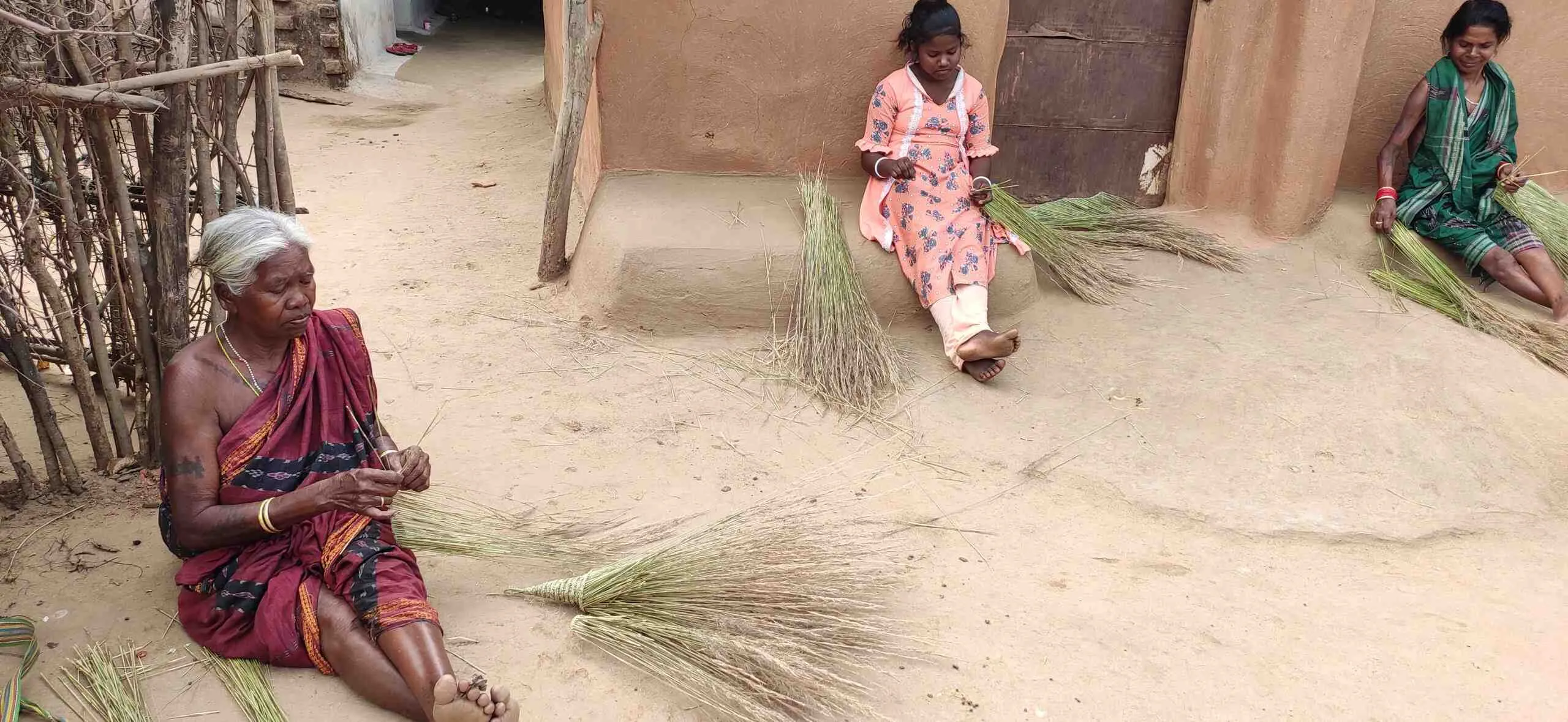 In the past, the foods of our village included gunji, kodo, mandia (ragi), sargu (jowar), maize, and bajra. People also cultivated local varieties of paddy. Grains like gunji, kodo, sargu, maize, bajra, and desi dhan were pounded in the dhenki (wooden husking tool) and cooked into pakhala (rice gruel) to eat. Mandia was made into cakes wrapped in leaves, and also ground on a stone grinder to prepare mandia pakhala. Maize was roasted in earthen pots and eaten as makalia (parched corn). People boiled jaggery water and drank it like tea. They also ate mahua flowers after boiling them, and boiled tol chhali (a kind of forest root). Other foods included sargu puffed rice, jumer (a local leafy green), pipal fruit, and the tender stalks of kaiphul (a local flower). For curries (dal), they used many varieties: sirel leaves, muti leaves, bhadur leaves, feng flower leaves, limi flower leaves, sajana (drumstick) leaves, makhan leaves, karela leaves, kukodo leaves, bahal leaves, bhaji leaves, radish leaves, and cabbage leaves. From the forest, people ate the tender stalks of pita, kuliha, phalsa, and fruits like khudu. They also ate various wild roots like dhaikantha and kandamula.