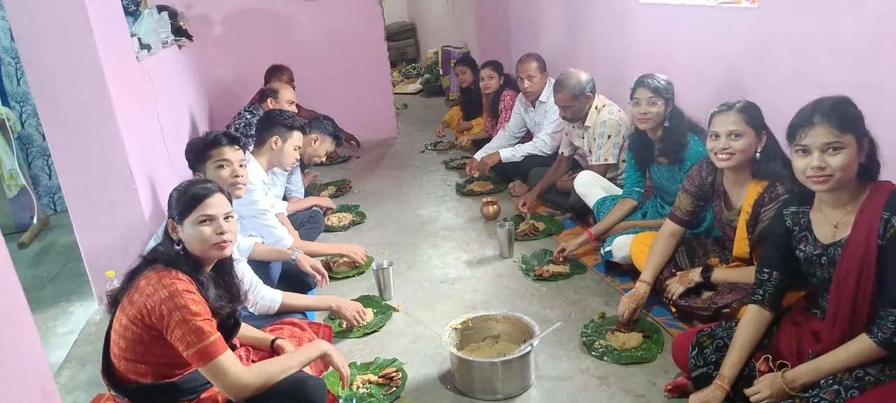 In earlier times, food was much simpler. At weddings, people offered chuda, gur, lia, and curd for snacks, while the feast included rice, Dal, meat curry, jukha, and arisa pitha. The arisa pitha is a famous delicacy of Western Odisha. In Bhadra month, the first harvest of paddy is celebrated with joy, marking Nabanna as an agriculture-based festival. On Nuakhai day, the new crop is first offered to the village deity before being used in household worship. Food and drink are prepared in abundance; families eat together, and younger members bow to elders after the meal. The evening is filled with merrymaking, visiting, and exchanging food. The village also has kirtan groups, women’s kirtan groups, and women’s danda nrutya groups. During festivals, women wear Sambalpuri sarees, while men wear dhoti and dhila.
