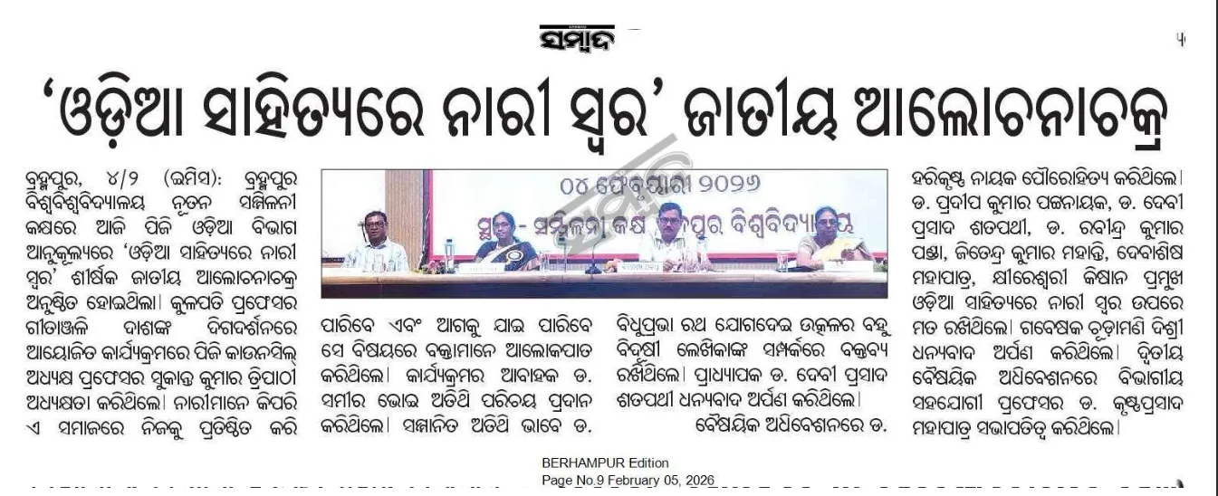 ଗତକାଲି ୨୦୨୬ ମସିହା ଫେବୃଆରୀ ୪ ତାରିଖରେ ବ୍ରହ୍ମପୁର ବିଶ୍ୱବିଦ୍ୟାଳୟର ଓଡ଼ିଆ ବିଭାଗ ଆୟୋଜନ କରିଥିଲା ଏକ ଜାତୀୟ ଆଲୋଚନାଚକ୍ର। ଏହି ଆଲୋଚନାଚକ୍ରର ବିଷୟବସ୍ତୁ ଥିଲା, “ଓଡ଼ିଆ ସାହିତ୍ୟରେ ନାରୀ ସ୍ୱର”। ଉଦ୍ଘାଟନୀ ସଭାରେ ଗାନ୍ଧୀଜୀଙ୍କ ଚିନ୍ତାଧାରାରେ ରଚିତ ସାହିତ୍ୟରେ ନାରୀର ସ୍ୱର ସମ୍ପର୍କରେ ପ୍ରଥମେ ଆଲୋଚନା କରାଯାଇଥିଲା।